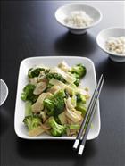 Heat the oils in a wok and stir fry the broccoli florets, bean sprouts, garlic, and ginger in a non-stick frying pan for 3 minutes with 3 tablespoons of stock. Add broccoli stalks, water chestnuts and bamboo shoots and toss for further minute.